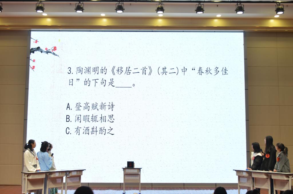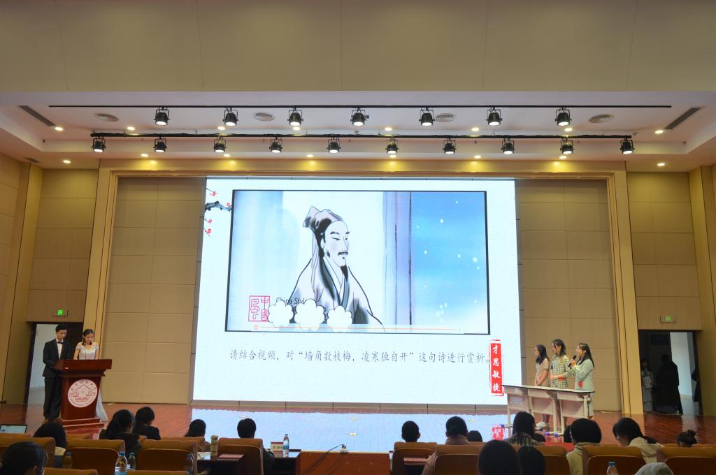 本次决赛共分三个环节,第一第二环节均分为两个部分,分别是“菁华迷云”“血勇为先”和“狭路相逢”“才思敏捷”,第三部分为飞花令。决赛现场上,各参赛队伍冷静作答,从容应对,反应敏捷,赢得了评委和观众的热烈掌声。比赛之余,诗朗诵《沁园春·长沙》和将古代诗词与现代元素相融合的诗词情景剧极大地调动了现场氛围。观众席上呼声阵阵,乐此不疲,充分展现了我校师生对传统诗词的喜爱之情。