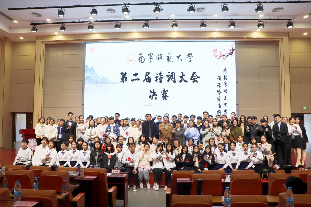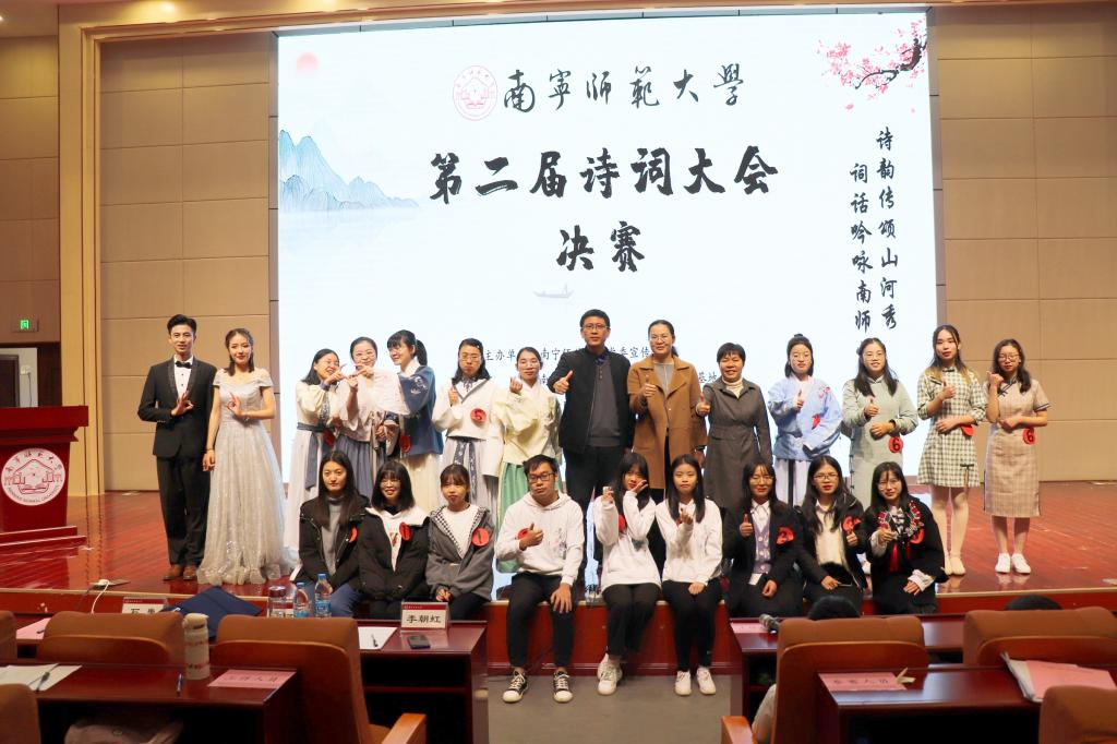 2020年12月6日上午,由南宁师范大学党委宣传部、南宁师范大学国家语言文字推广基地、共青团南宁师范大学委员会、南宁师范大学教务处联合主办,南宁师范大学学生会承办的“诗韵传颂山河秀,词话吟咏南师情”南宁师范大学第二届诗词大会决赛在五合校区文科综合楼114报告厅拉开序幕。担任此次比赛的评委有团委书记区丽媛、文学院石勇副院长、文学院李朝虹副教授。来自全校400余名学生观众共同观看本场比赛。