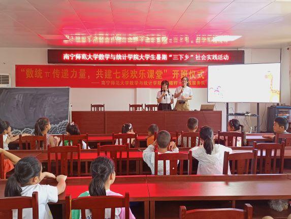 为全面贯彻落实党的教育方针,实施推进素质教育,进一步丰富充实青少年的暑假精神文化生活,教育引导青少年健康成长成才。7月14日至7月17日,南宁师范大学数学与统计学院2022年暑期“三下乡”石榴籽π实践服务队分别到武鸣区城厢镇渡头建设社区青空间和西乡塘区明秀青空间,开展以“数统π传递力量,共建七彩欢乐课堂”为主题的七彩课堂活动。