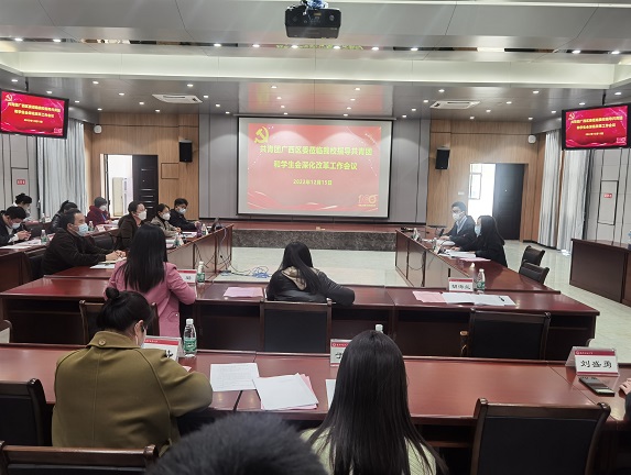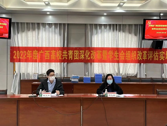 12月15日下午,共青团广西区委学校部干部黄乙静、广西学联驻会执行主席陈允杰一行2人到我校武鸣校区开展2022年度广西高校共青团深化改革暨学生会组织改革评估实地复核工作。校团委全体成员、学工部、研工科相关负责人、武鸣校区各学院团委书记以及学生会(研究生会)代表参加会议。会议由校团委书记区丽媛主持。