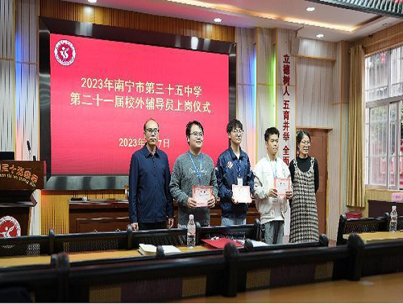 仪式上,黄老师首先感谢我校上一任三十名校外辅导员过去一年工作的辛勤付出。一年来,辅导员们共组织24次主题班会,协助班主任进行班级管理,辅助学校策划开展元旦晚会、校运会等活动,在助力三十五中社团建设与管理,提高学生心理健康水平,丰富课外活动作出了积极的贡献,同时给新一届校外辅导员介绍了南宁第三十五中学的基本情况、本学年的工作计划及工作任务,说明工作注意事项等。随后,邓慧珍书记和陈群生副校长分别给第二十届优秀辅导员颁发荣誉证书、聘书及实习证明。